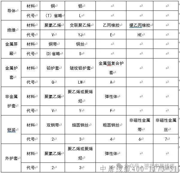 以下是電力電纜各部分結(jié)構(gòu)材料的代號(hào)